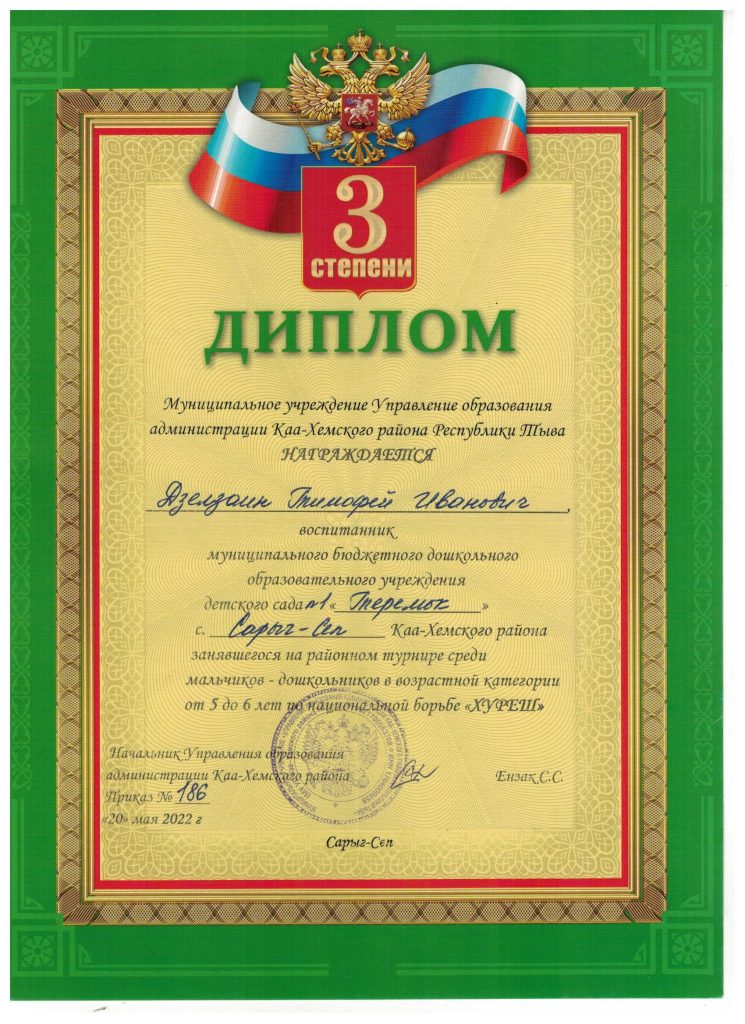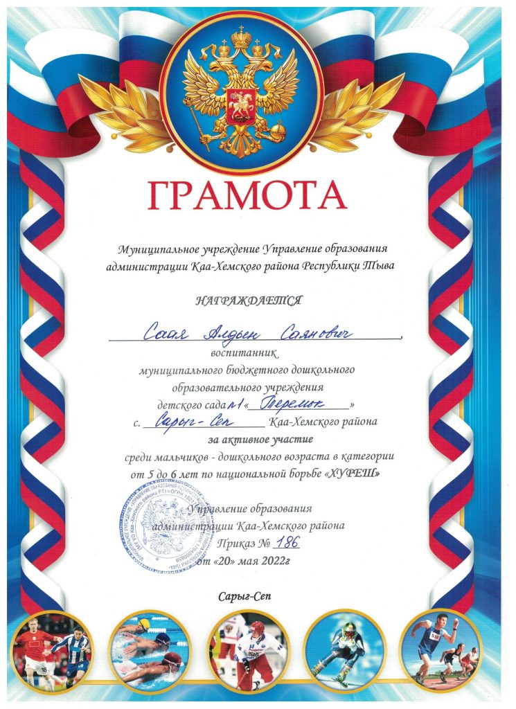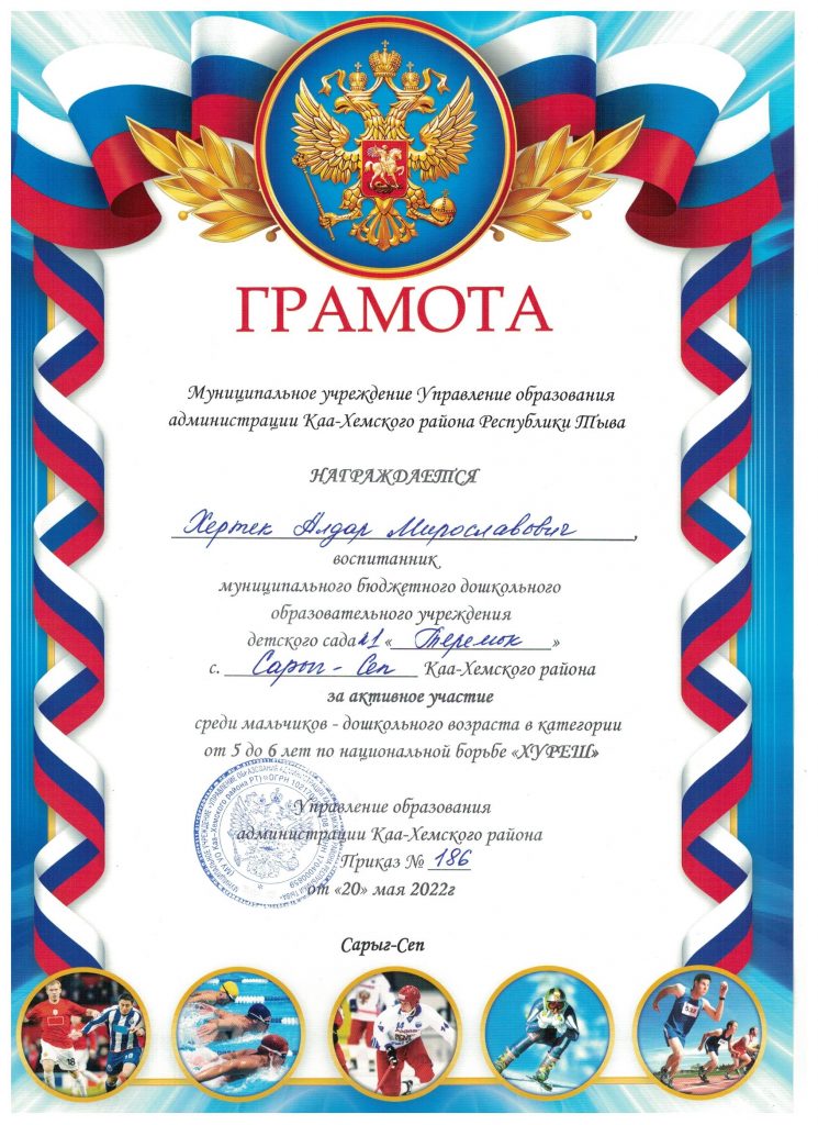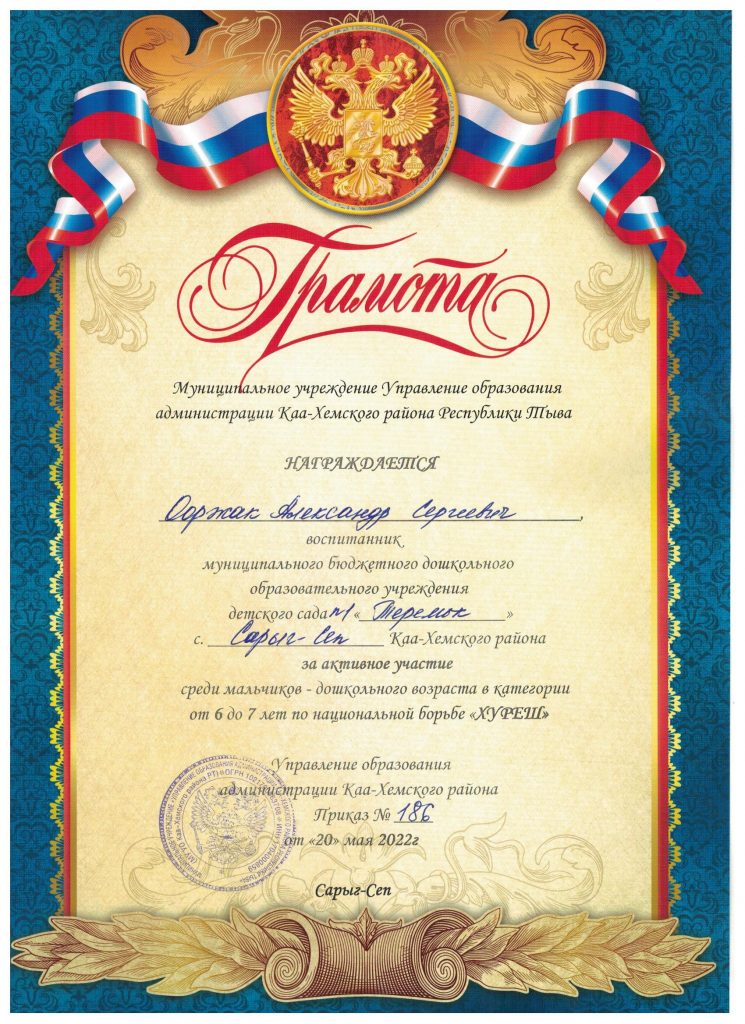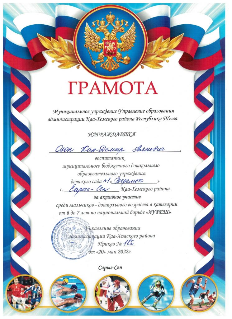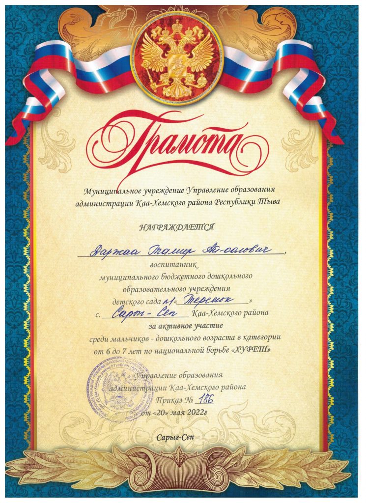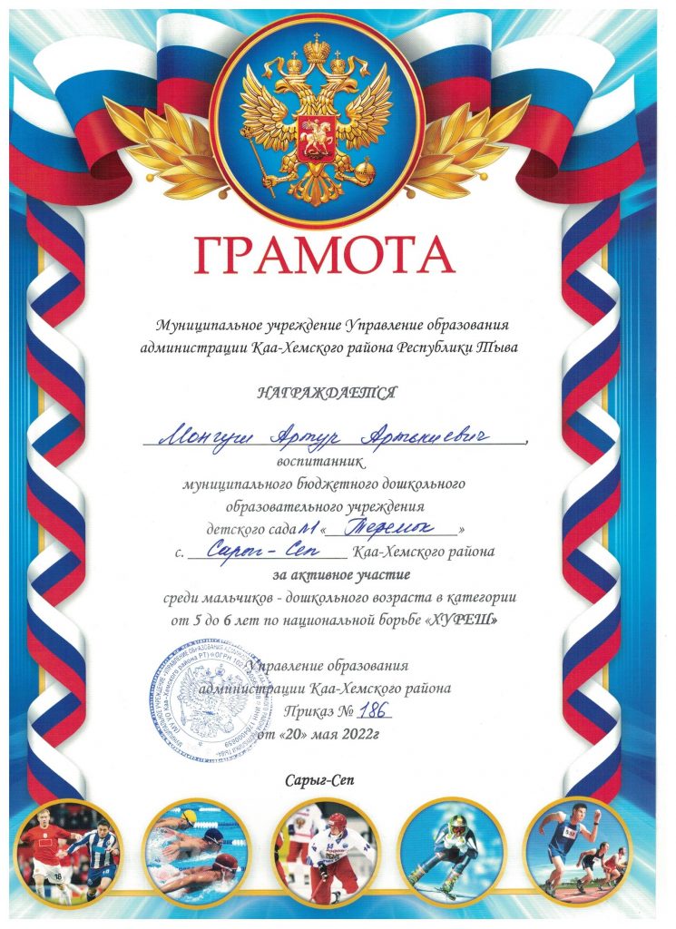 Без рубрики Муниципальный этап Хуреш 23.05.2022 / На муниципальном этапе принимали участие воспитанники детского сада в возрасте 5-7 лет в количестве 10 детей. Дзелзаин Тимофей Иванович — диплом 3 степени Остальные участники из нашего детского сада награждены грамотами за активное участие